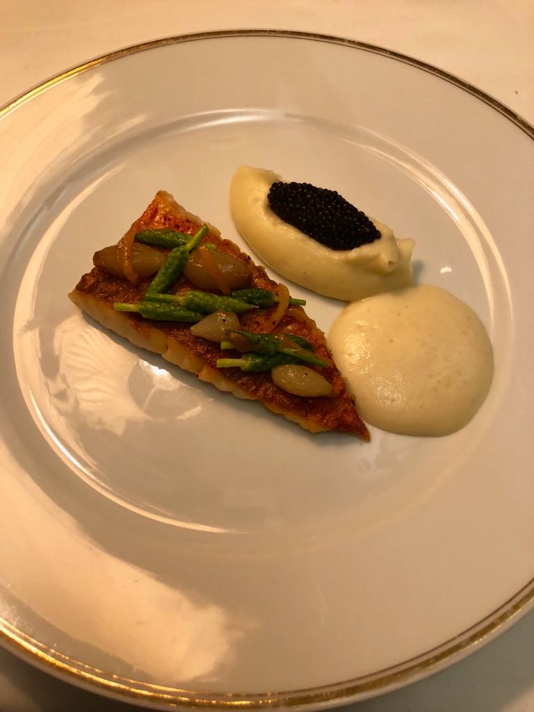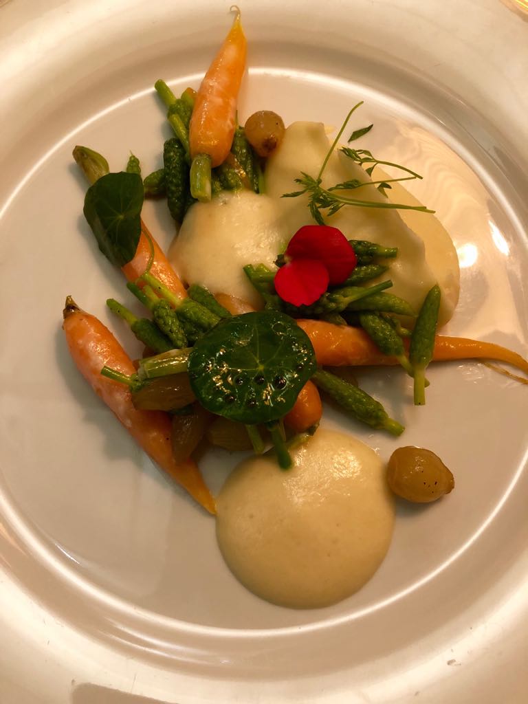 By this time, I would normally have been completely full, but today, I was simply excited to receive my vegetable surprise; and this was certainly one restaurant where over-indulgence was a definite risk! Our mains arrived – on warm plates, which is always a pleasure for me – and each had an explosion of colors that let us know those in the kitchen knew that summer had arrived. Instagram, anyone? The first was a plate celebrating the vegetables of the season – wild green asparagus tips, onions which tasted of sweet chestnuts, and baby heirloom carrots in multiple colors. This was served with two purees, one of white asparagus, sea salt and cane sugar, and the second of truffled mashed potatoes. N’s main was a pan-roasted red mullet filet, served with the same wild asparagus and a bisque.